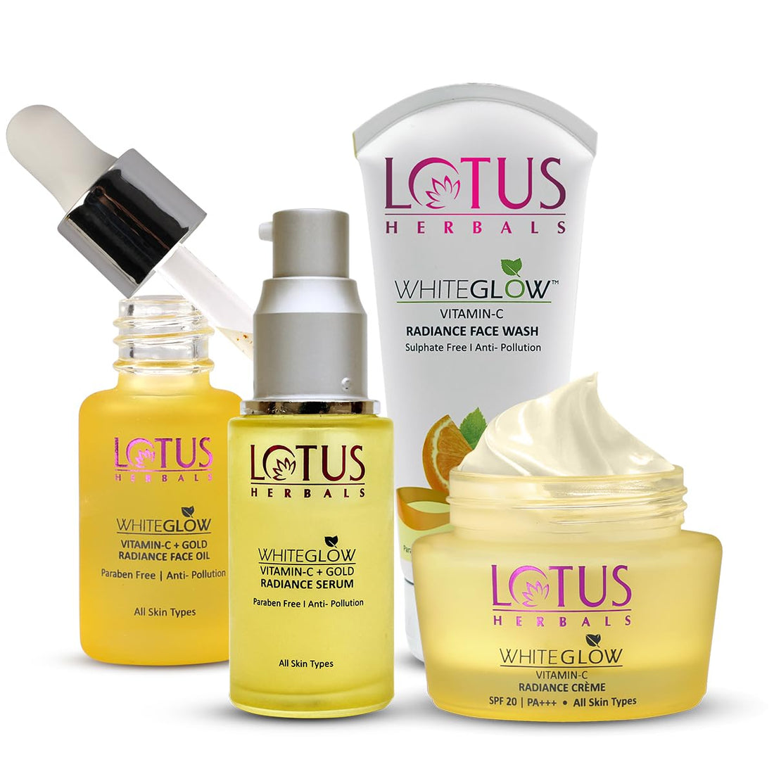Lotus Herbals WhiteGlow Vitamin C and Gold Radiance Face Wash(100g) + Face Oil(15ml) + Face Cream(50g) + Face Serum(30ml) | 195g
